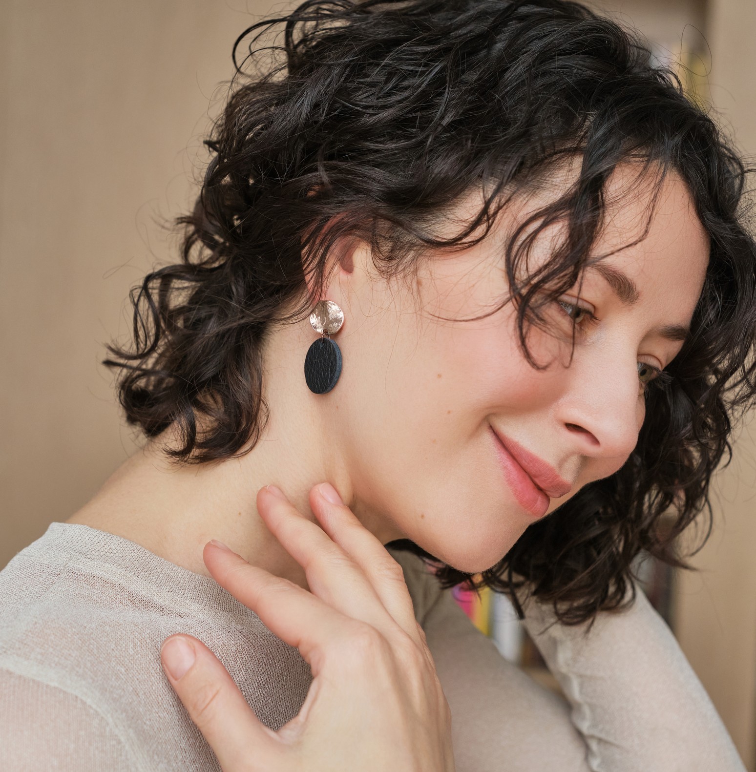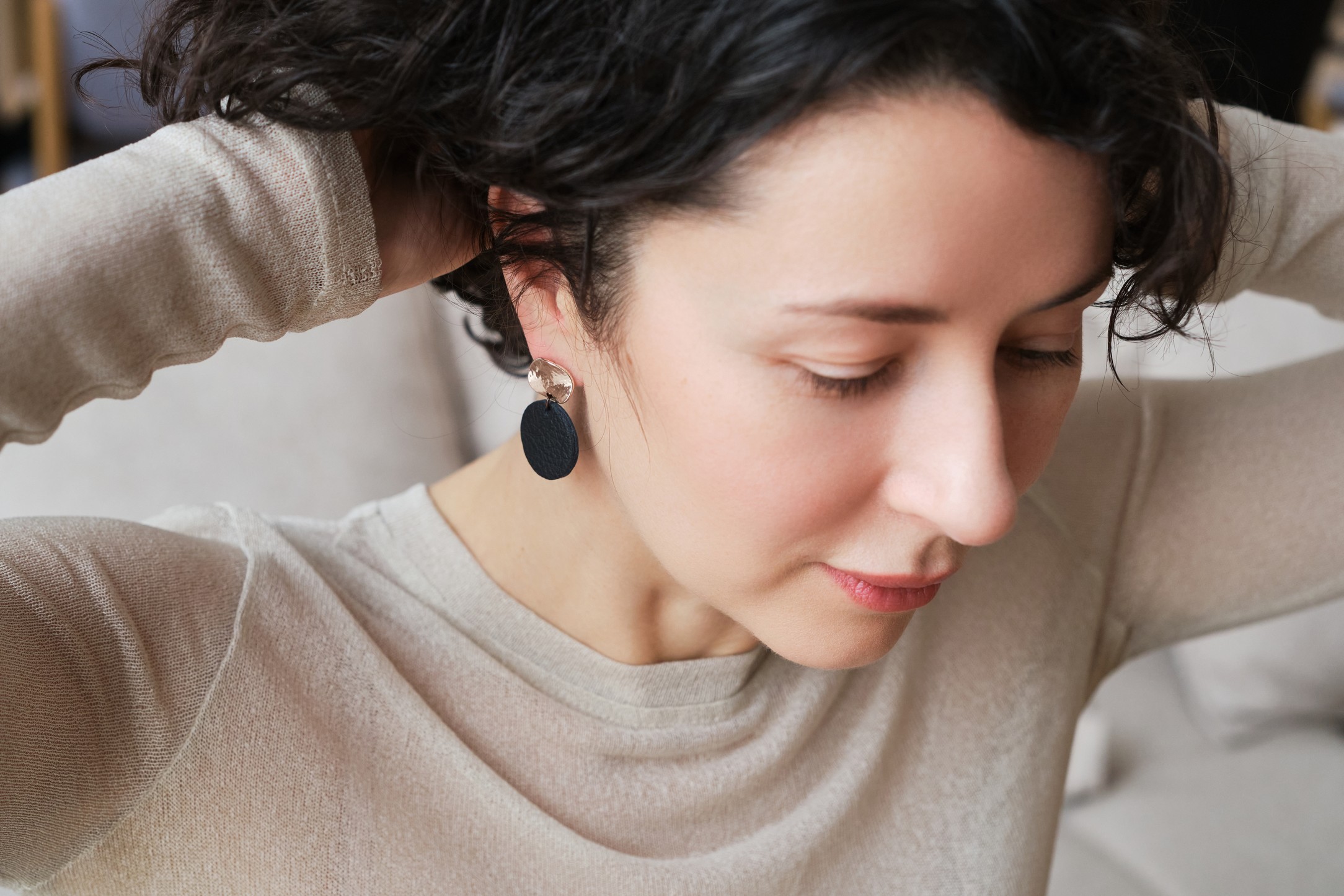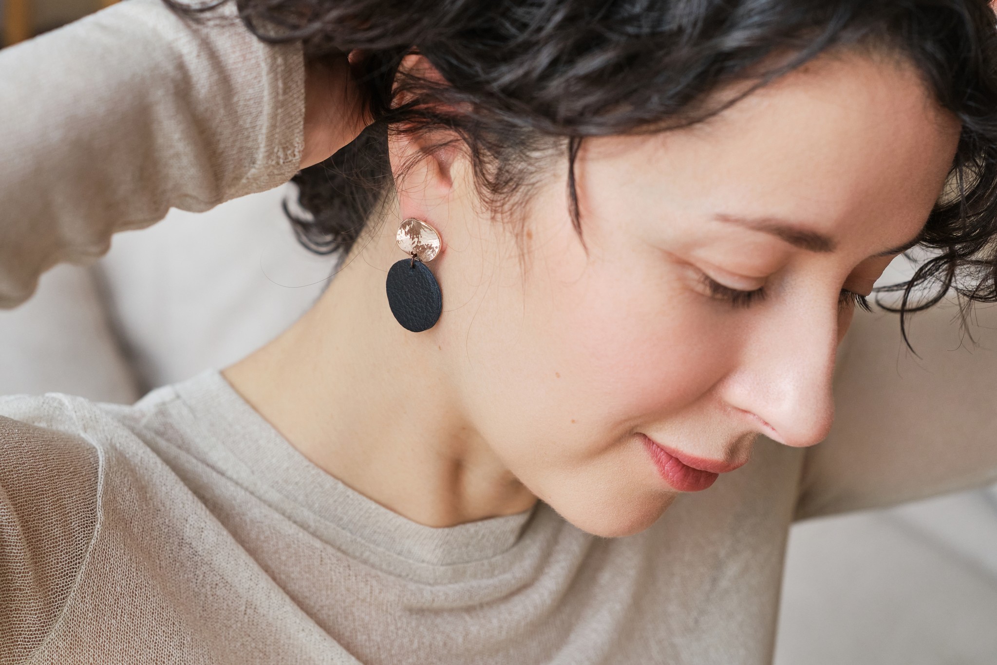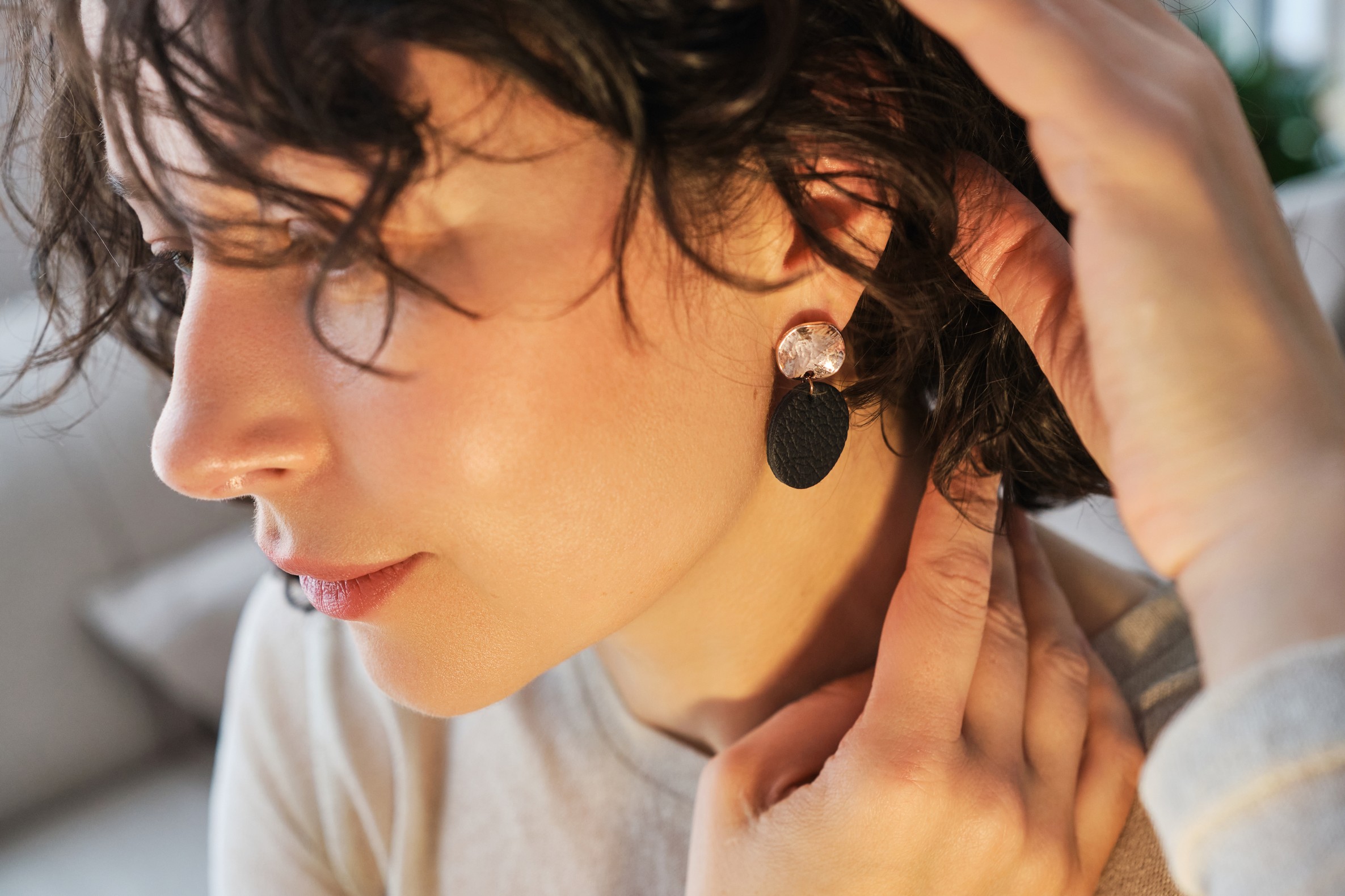 Recycled leather and domestic reindeer leather are the main materials used in the jewellery. Metal parts are made of jewellery steel.
