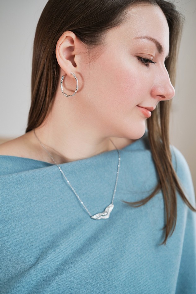 Valmistamme korut nikkelivapaasta lyijyttömästä korutinasta. Korunosat ovat koruterästä. Tina on melko pehmeä ja hopeaa hieman tummempi metalli. Se ei kuitenkaan ole yhtä herkkä muuttamaan väriä / tummumaan kuin hopea ja lakkapinta korun pinnassa suojaa kiiltoa. Korun voi puhdistaa miedolla pesuaineella, mutta kannattaa välttää hankausta, jolloin suojaava lakkapinta ei vaurioidu.