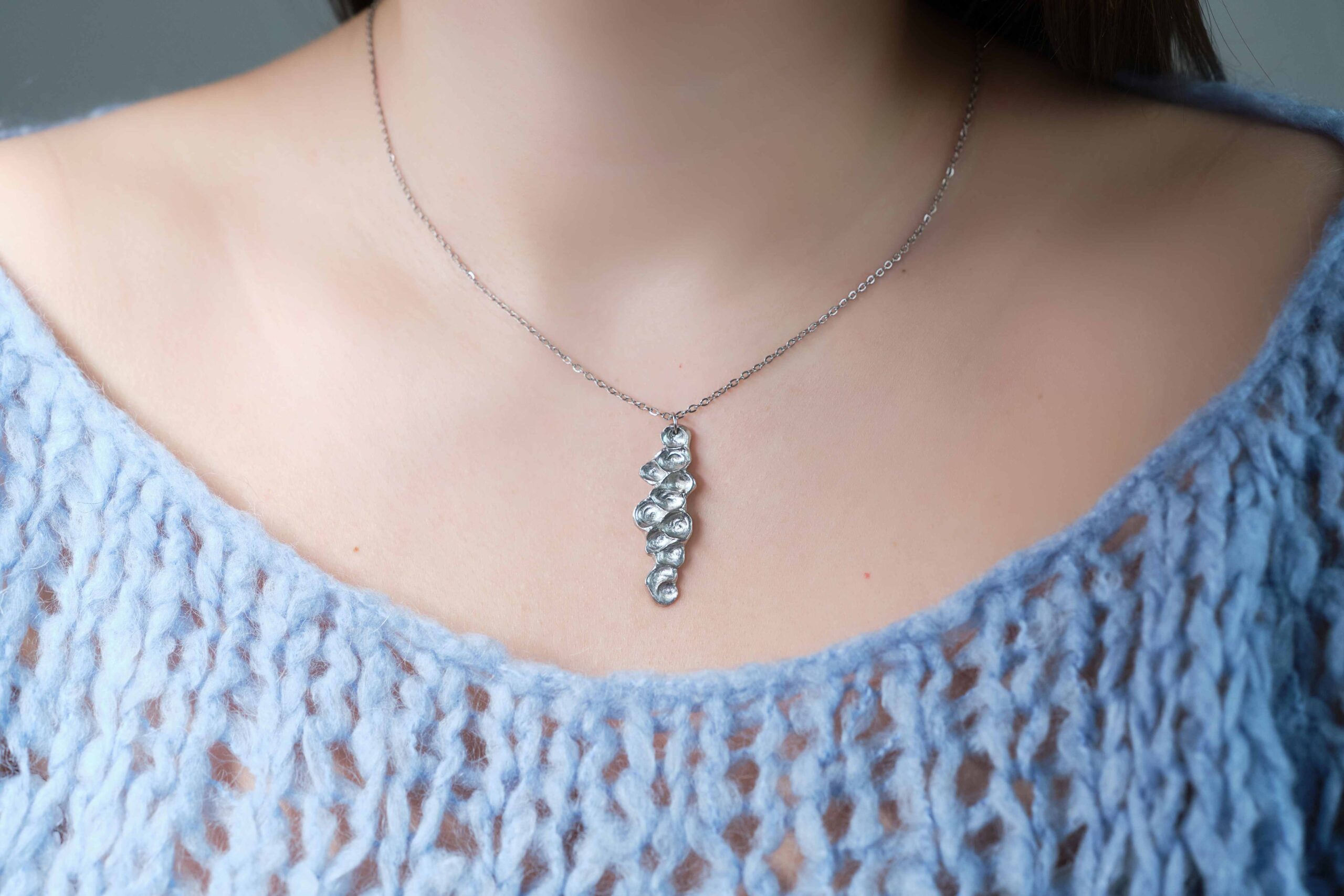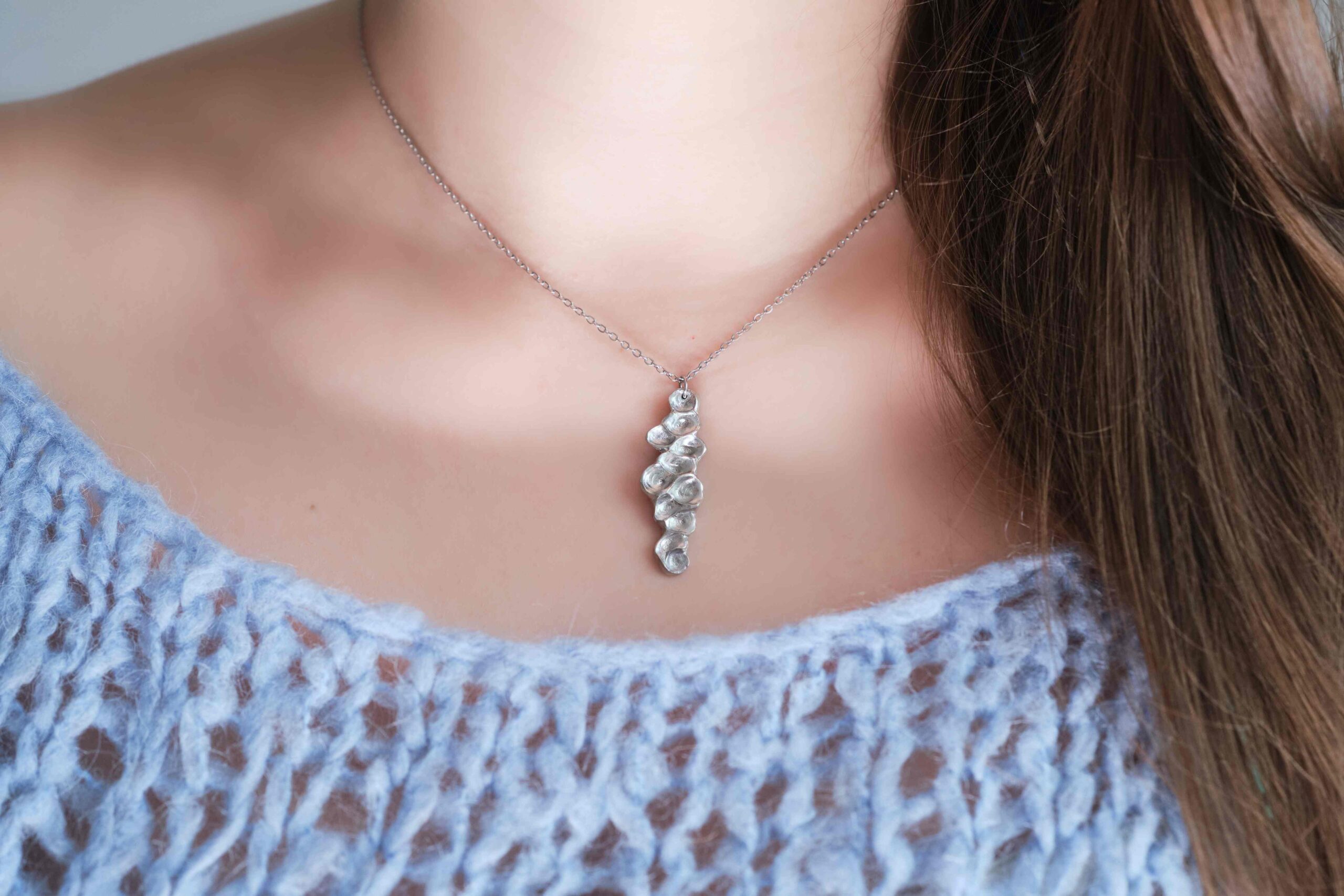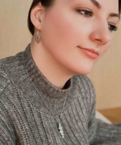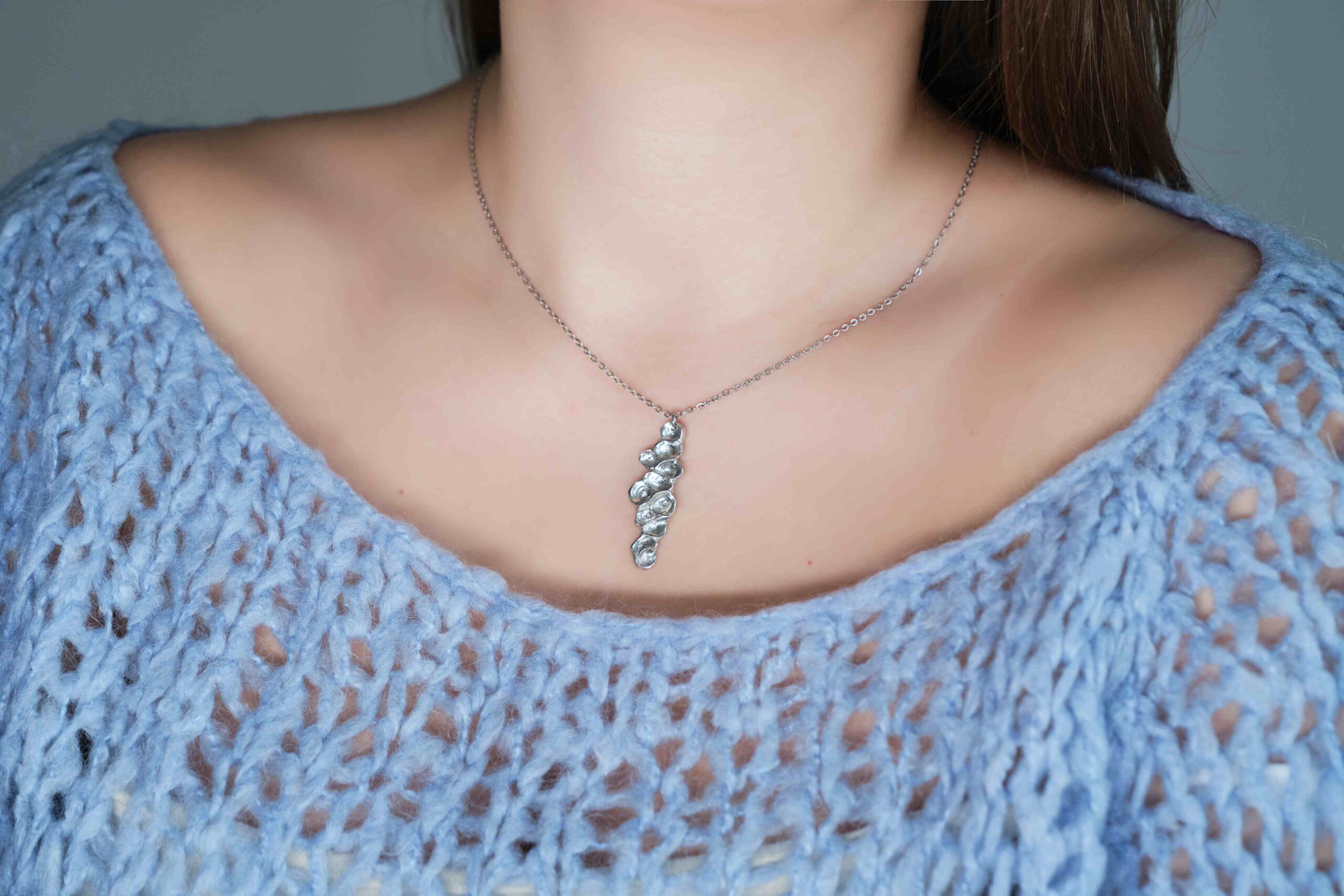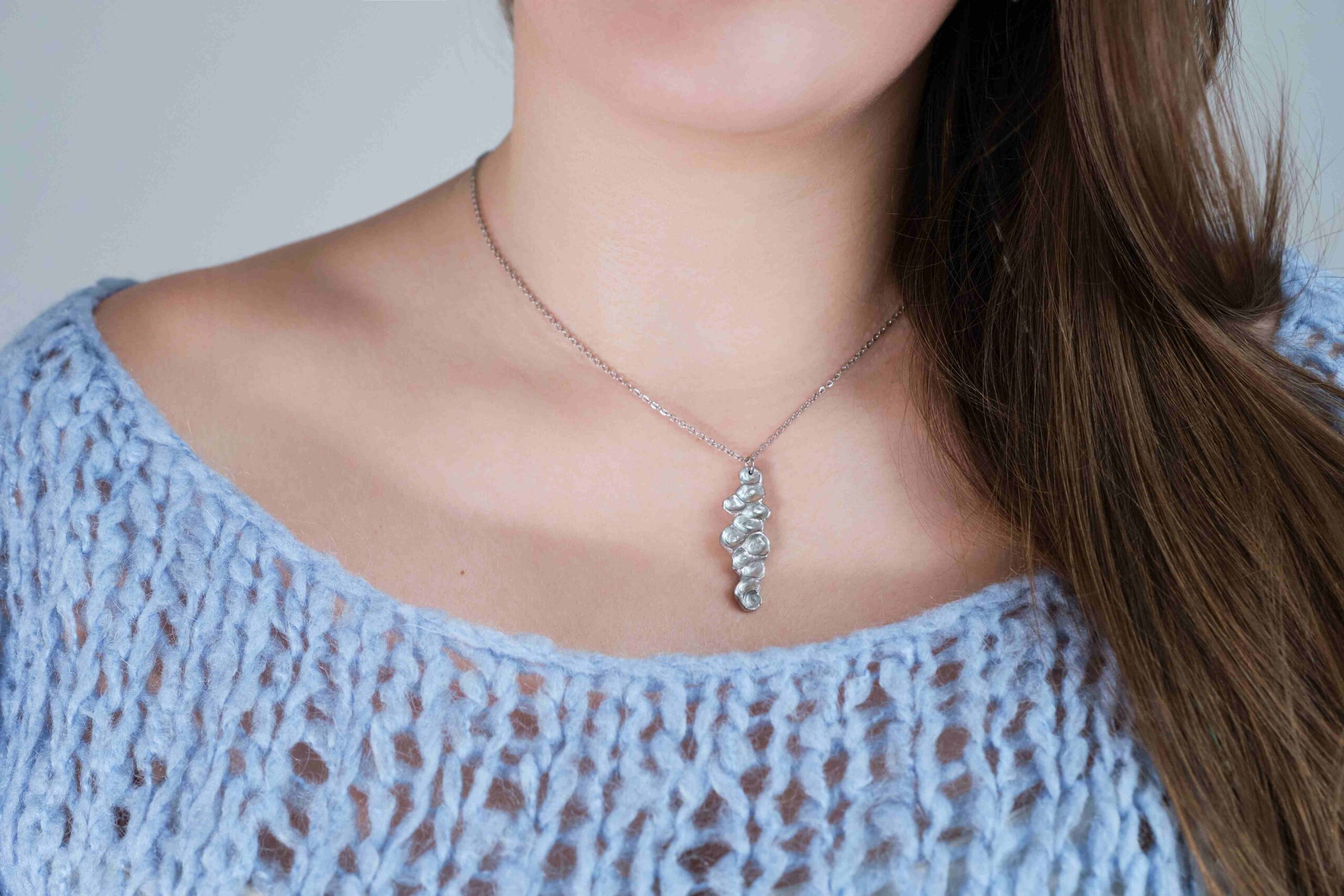 Valmistamme korut nikkelivapaasta lyijyttömästä korutinasta. Korunosat ovat koruterästä. Tina on melko pehmeä ja hopeaa hieman tummempi metalli. Se ei kuitenkaan ole yhtä herkkä muuttamaan väriä / tummumaan kuin hopea ja lakkapinta korun pinnassa suojaa kiiltoa. Korun voi puhdistaa miedolla pesuaineella, mutta kannattaa välttää hankausta, jolloin suojaava lakkapinta ei vaurioidu.