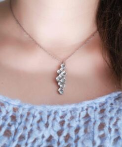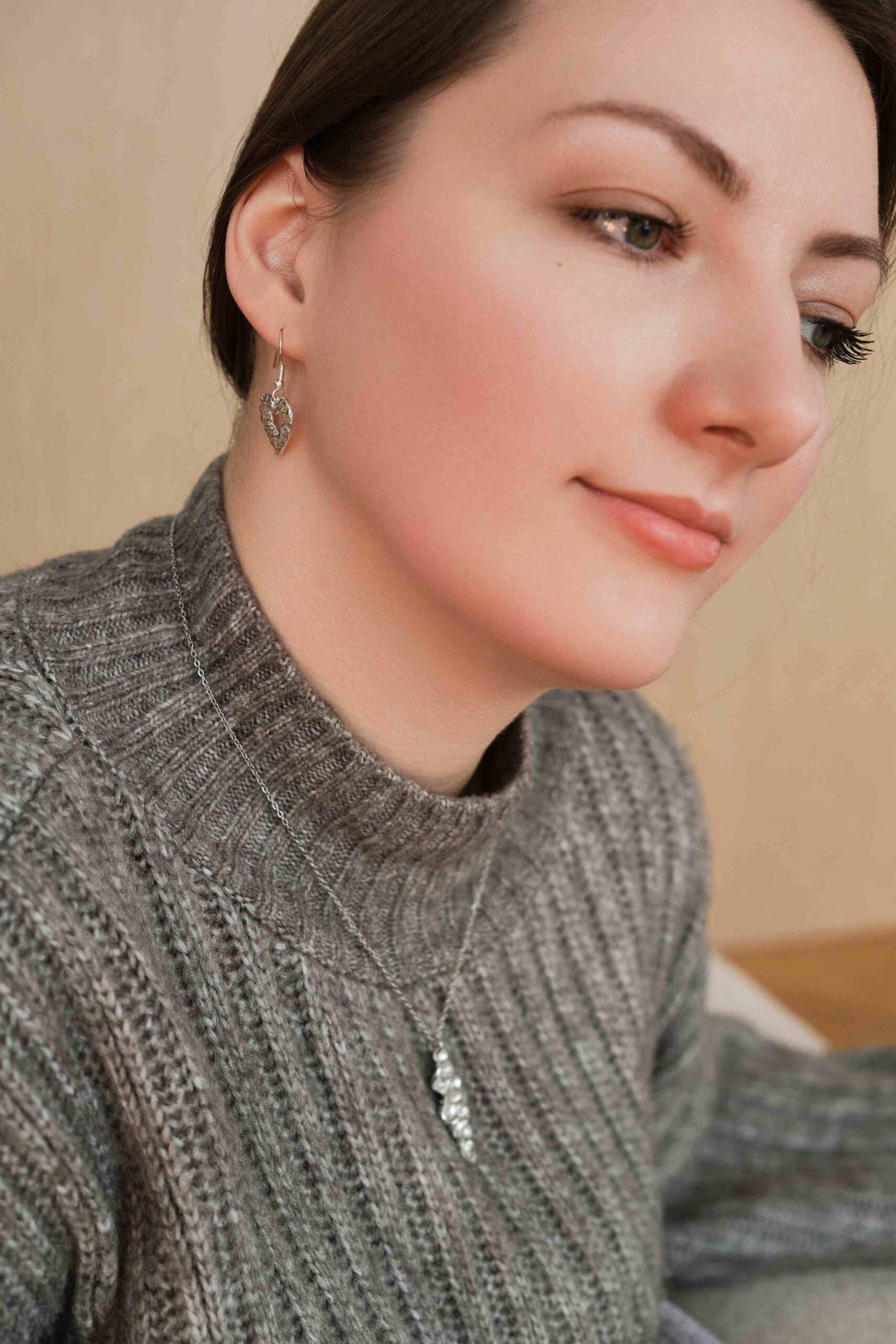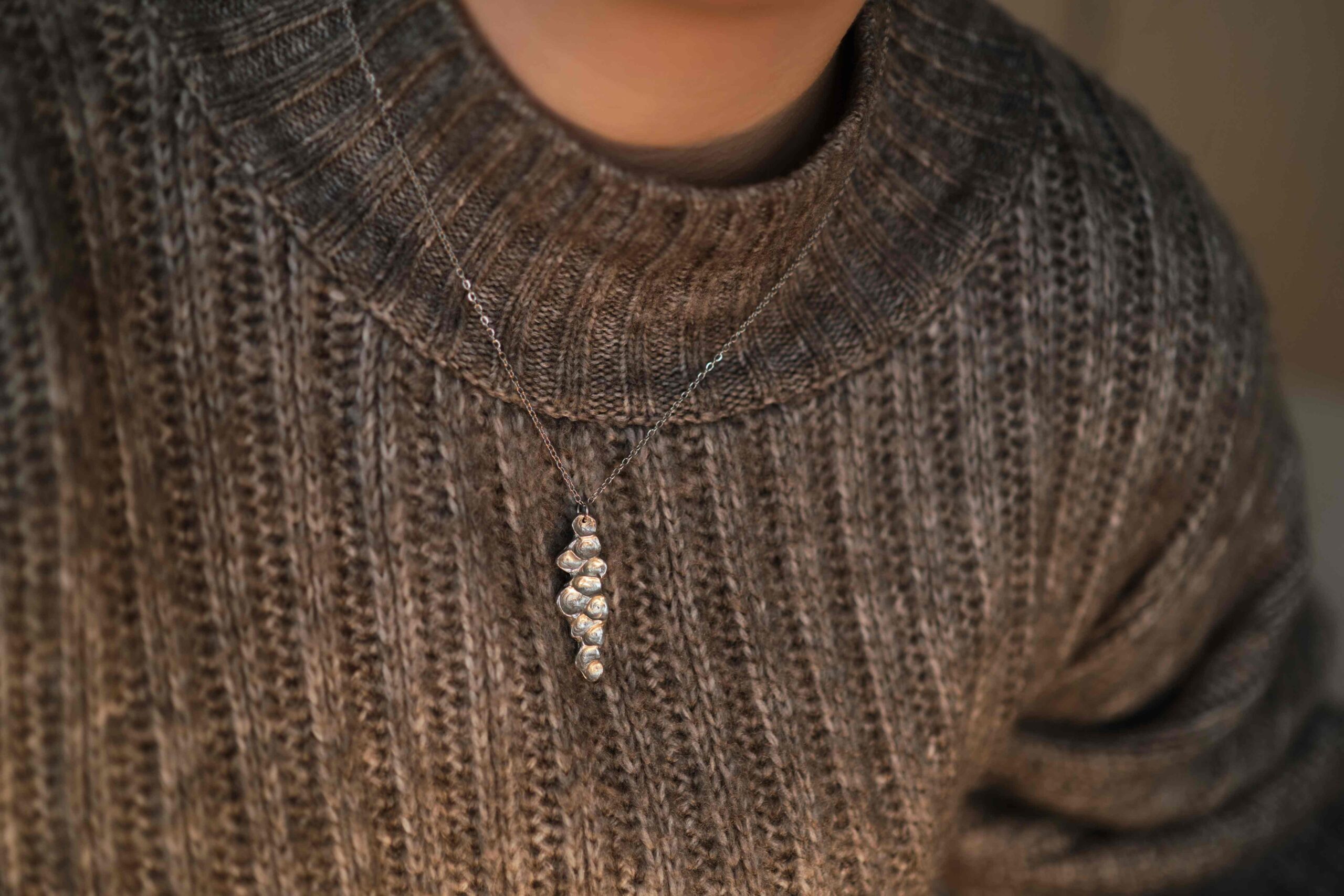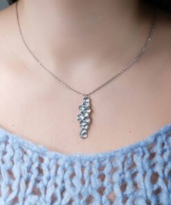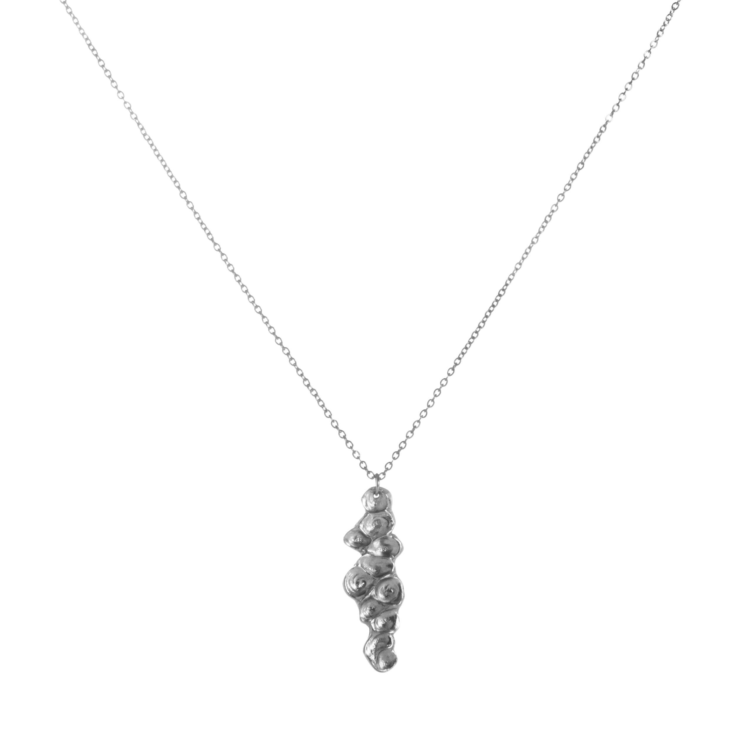 Valmistamme korut nikkelivapaasta lyijyttömästä korutinasta. Korunosat ovat koruterästä. Tina on melko pehmeä ja hopeaa hieman tummempi metalli. Se ei kuitenkaan ole yhtä herkkä muuttamaan väriä / tummumaan kuin hopea ja lakkapinta korun pinnassa suojaa kiiltoa. Korun voi puhdistaa miedolla pesuaineella, mutta kannattaa välttää hankausta, jolloin suojaava lakkapinta ei vaurioidu.
